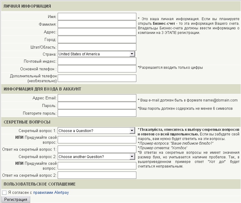 Для регистрации счета в AlertPay заполните следующую форму. Убедитесь, что введенная информация правильная, так как мы будем сравнивать ее с информацией при любом типе верификации. Введенная информация используется только для внутренних нужд. См. Соглашение о конфиденциальности.